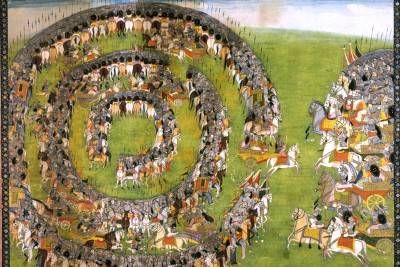 Les deux armées s’affrontent. École pahāṛī, Kāṇgrā, vers 1820. Gouache et or sur papier. Collection particulière. (Copyright : Photothèque Enrico Isacco) |