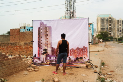 Deuxième étape : la recherche de lieux dans Gurgaon offrant un bon point de vue sur des ensembles immobiliers existants, et l’installation d’une bâche devant cette toile de fond. Détail important : les publicités ainsi affichées n’ont aucun lien avec les immeubles photographiés en fond de décor puisque, souligne Arthur Crestani, « le plus souvent, les travaux n’ont même pas commencé ».